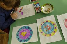 Рисование. Раскрась тарелочку. Дети учились расписывать тарелочку, нанося узор по кругу и середине. Рисовали кистью, соблюдая технику безопасности и аккуратность в работе.
