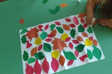 Коллектвная работа детей "Осенний ковер", умение закреплять работу ножницами, вырезание простых предметов из бумаги.