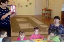 Библиотекарь сельской библиотеки познакомила детей детского сада со свежими номерами детских журналов и газет .