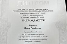 8а сыйныфы укучысы Гараева Язилә татар гомуми белем бирү оешмаларында белем алучы укучылар өчен татар теленнән республика олимпиадасының йомгаклау этабы призёры булды. Укытучысы - Даутова Гөлчәчәк Минсалиховна. Уңышларыгыз белән котлыйбыз!