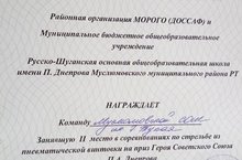 На базе Русско-Шуганской общеобразовательной школе им. П.Днепрова Муслюмовского муниципального района РТ прошли соревнования по стрельбе из пневмотической винтовки на приз Героя Советского Союза П.А.Днепрова.Команда Муслюмовской СОШ им. Тукая заняла 2-ое место.Ученица 10а класса Бадретдинова А. и Шаймухаметов И. заняли призовые места и были награждены грамотой.Поздравляем и гордимся ими!