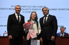 Бүген, район Советының отчет сессиясендә, Васил Шәйхразиев хезмәттәшебез Гөлчәчәк Минсалиховнага Атказанган укытучы дигән мактаулы исемне һәм медаль тапшырды.