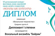 Поздравляем вокальный ансамбль «Бәйрәм» (рук. Ибрагимова Э.И) с блестящей победой на VI региональном конкурсе-фестивале «Моңлы Ык буйлары»! Ребята стали дипломантами I степени в номинации «Вокальное творчество», проявив настоящий талант и артистизм. Желаем коллективу новых творческих свершений, ярких выступлений и вдохновения на пути к новым вершинам!