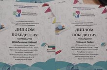 Чарыева Сафия 1 класс, Шайдуллина Зайнаб 1 класс стали победителями, Чернов Даниэль 1 класс, Абдразакова Айсылу 1 класс, Мадьяров Данис 2 класс - призёрами республиканской олимпиады по математике "Математический марафон". Руководители Закирова И.И., Каюмова Д.А., Асманова Г.И. Поздравляем. Молодцы