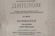 Мәктәбебезнең 11 нче сыйныф укучысы Зиатдинова Айназ хокук фәненнән(укытучысы Йолдыз Асадуллина) Республикакүләм мәктәп укучылары олимпиадасының йомгаклау этабында призер булды. Котлыйбыз! Киләчәктә дә уңышлар телибез.