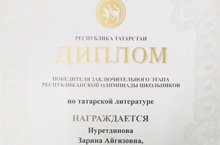 Ученица 8 класса Нуртдиновой Зарины стала победителем заключительного этапа республиканской олимпиады школьников по татарской литературе(учитель Гульчачак Даутова). Поздравляем! Желаем дальнейших успехов