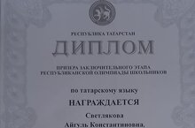 Ученица 7 класса Светлякова Айгуль стала призером заключительного этапа республиканской олимпиады школьников по татарскому языку(учитель Гульназ Гайнетдинова). Поздравляем! Желаем дальнейших успехов.