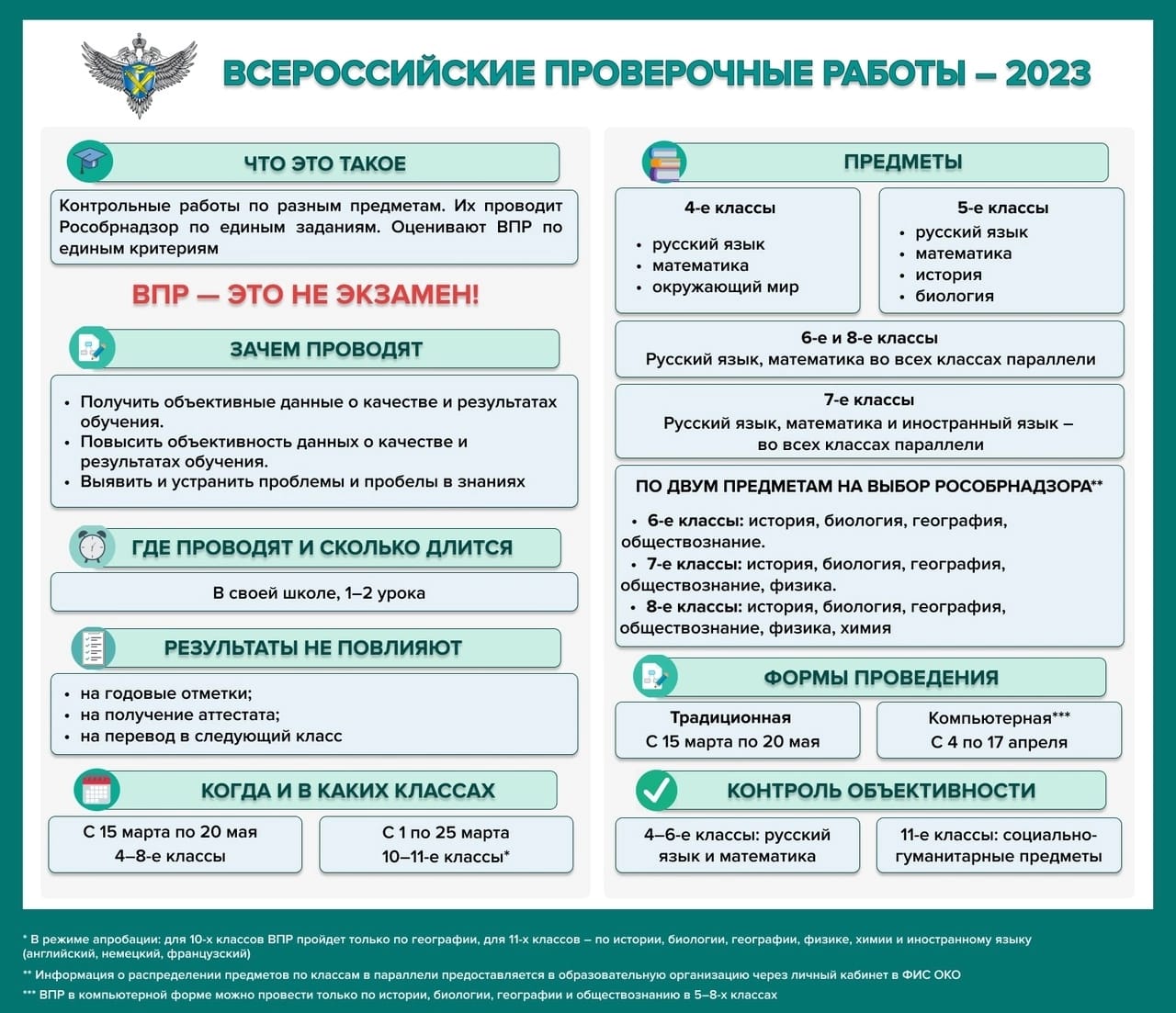Опубликовано: 18.01.2023Рособрнадзор утвердил сроки ВПР в 2023 году (приказ от 23.12.2022 № 1282). Приказ содержит периоды, в которые можно провести работы. ВПР пройдут с 15 марта по 20 мая в 4–8-х классах и с 1 по 25 марта в 10–11-х классах. Конкретные даты из периодов определяет школа самостоятельно. Подробную информацию можно получить перейдя по ссылке