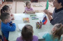 Балалар рәсем шөгылендә дәүләтебез символы булган флаг белән таныштылар һәм тоташ сызык белән турыпочмаклык ясап аны буярга өйрәнделәр.Познакомили детей с государственными флагами РФ и РТ.