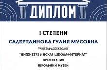 Руководитель школьного музея Садертдинова Г. М. участвовала в республиканском конкурсе профессионального мастерства «Музей как инновационное, современное образовательное пространство» и награждена дипломом 1 степени.