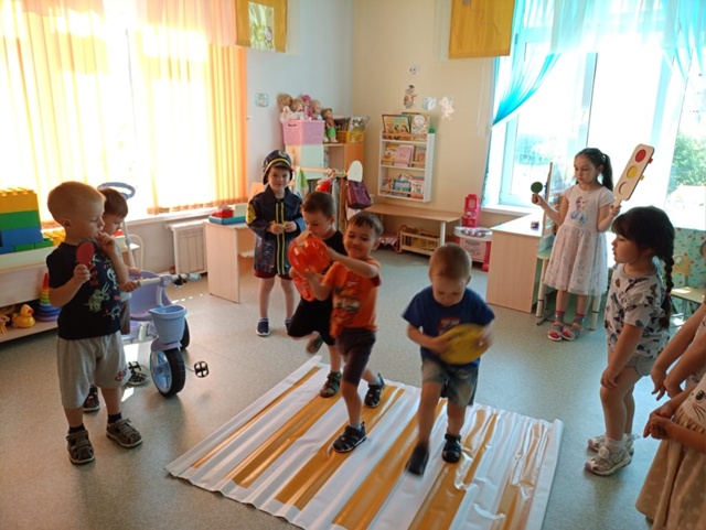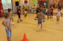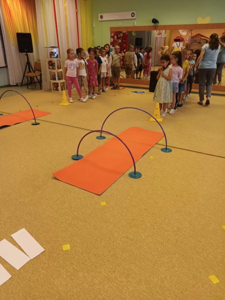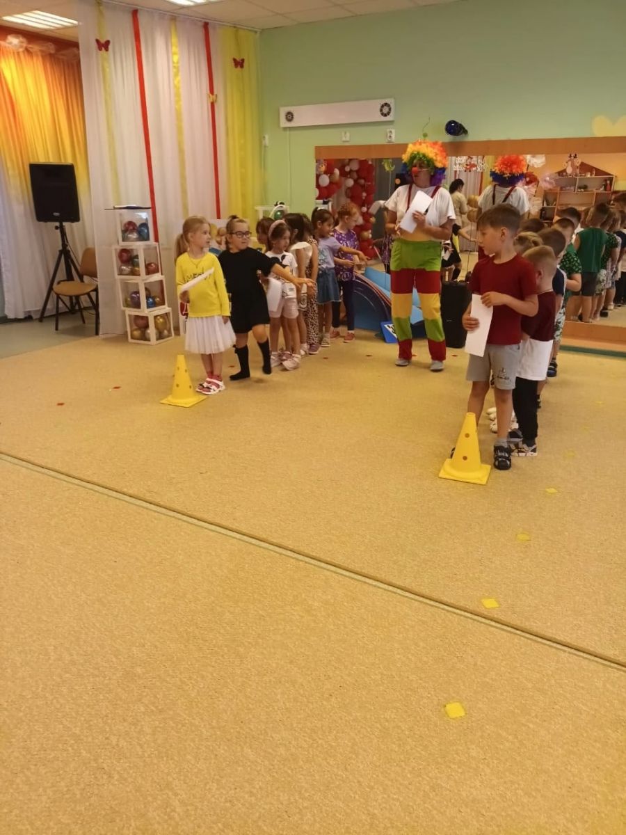 Вместе с Незнайкой дети играли в захватывающие игры, участвовали в эстафетах, пели и танцевали.