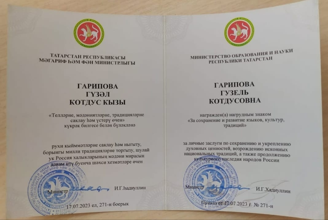 Наш педагог - Гарипова Гузель Котдусовна награждена нагрудным знаком "За сохранение и развитие языков,культур,традиций"