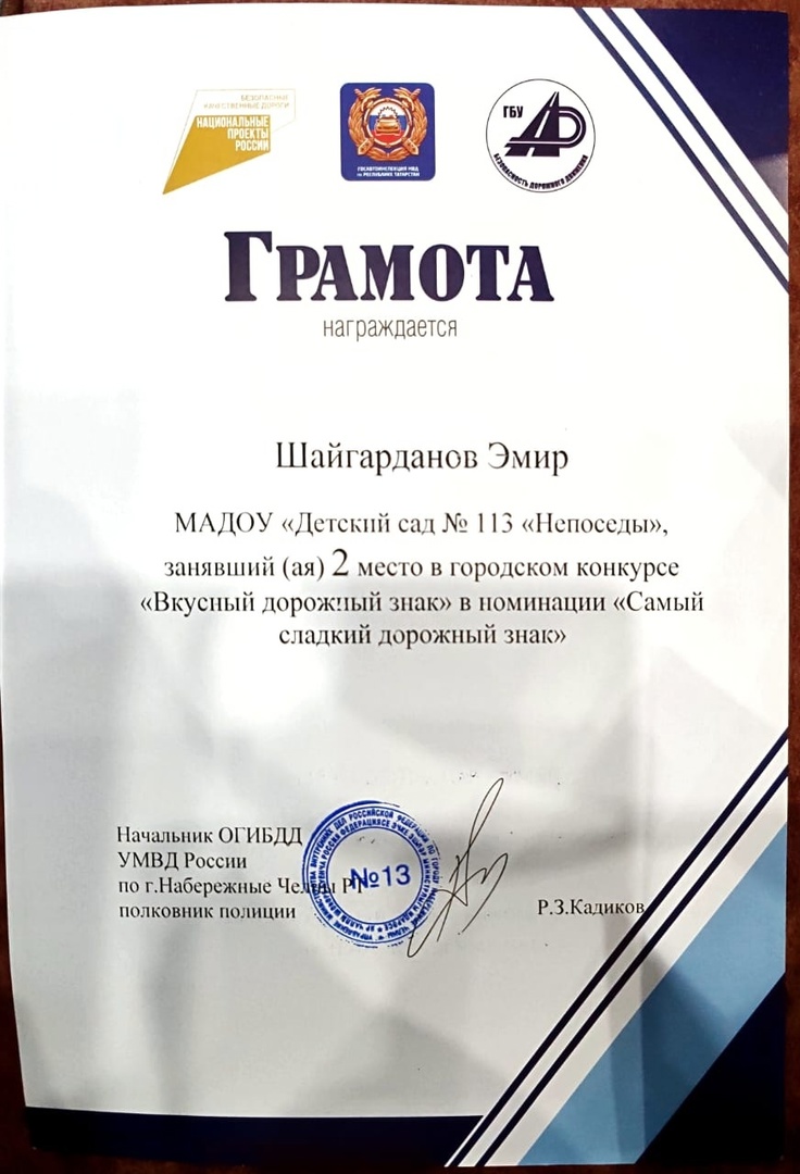 Поздравляем воспитанника гр №9 МАДОУ «Детский сад №113 «Непоседы» Шайгарданова Эмира, его родителей и воспитателя Валиуллину Г.И. с победой в городском конкурсе «Вкусный дорожный знак»