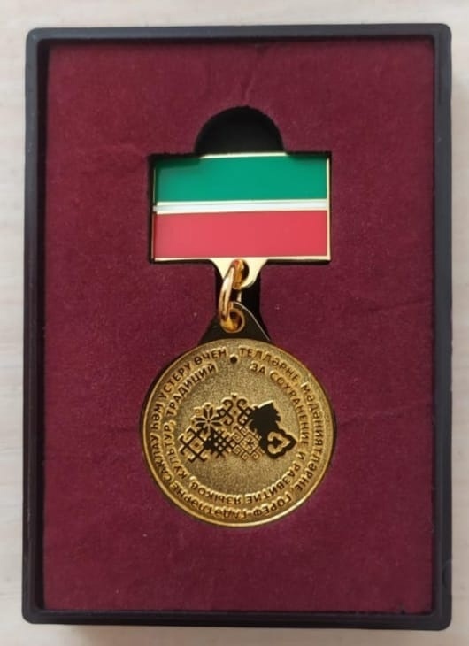 за личные заслуги по сохранению и укреплению духовных ценностей, возрождению исконных национальных традиций,а также продолжению культурного наследия народов России.Поздравляем Гузель Котдусовну с заслуженной наградой и желаем дальнейших творческих успехов и побед!!!