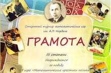 - Хуснутдиновой Адели,занявшую III место в открытом турнире математических игр им. А.П.Нордена «Математические крестики-нолики» и «Математическая абака». Объявляется благодарность учителю математики Егоровой Раушание Леонидовне. МОЛОДЦЫ!!! ЖЕЛАЕМ ДАЛЬНЕЙШИХ УСПЕХОВ!!!