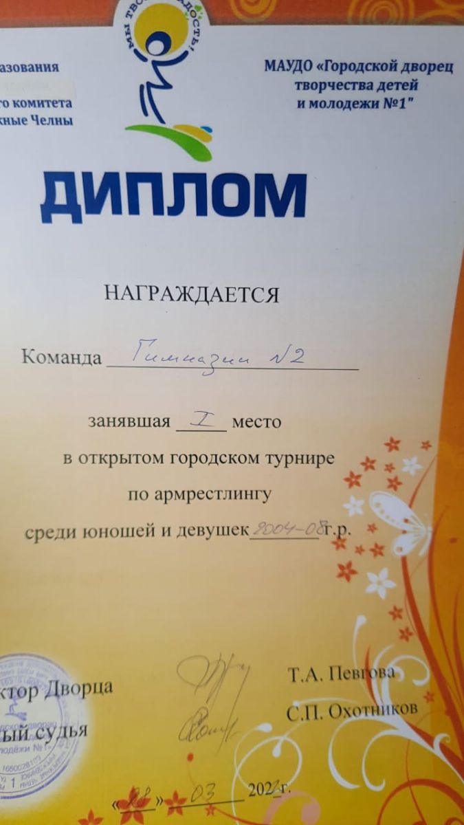 2004-2008 елгы ир балалар һәм 2006-2007 елгы кыз балалар өчен армрестлинг буенча шәһәркүләм бәйгедә Хабибуллин Илнур Рафаэлевич җитәкләгән команда беренче урын яулады. Шаехов Райнур, Хаертдинов Рамил, Ясабиева Розалина, Муллаяров Нияз, Габидуллин Адел – әлеге көчле командада чыгыш ясаучы укучылар. Афәрин, гимназиянең көчле спортсменнары!