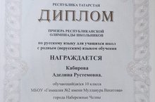 Рус теленнән республикакүләм олимпиадада ПРИЗЕР булган 10б сыйныф укучысы Кабирова Аделинаны чын күңелдән котлыйбыз! Укучыны олимпиадага әзерләгән Зухурова Айгөл Рамилевнага зур рәхмәт белдерелә!
