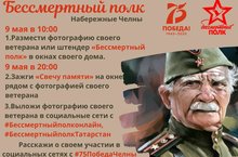 Несмотря на ограничительные меры, празднование 75-летней годовщины Дня Победы все же состоится. Большая часть мероприятий пройдет в Интернете. Челнинцы принимают активное участие в федеральных проектах. Как рассказал заместитель руководителя Исполнительного комитета Рамиль Халимов, в 10:00 в новом формате стартует акция «Бессмертный полк»: «Мы попросили горожан выставить на окна портреты участников Великой Отечественной войны, которые они несли в прошлом году», – пояснил он.В 19:00 по всей стране пройдет минута молчания, а в 19:01 челнинцам предлагают спеть песню «День Победы» из окна своего дома. Завершится день акцией «Свеча памяти». Каждый желающий может зажечь свечу или фонарик у портрета родственника – участника Великой Отечественной войны. Начнется акция в 21:50.Кроме того, в этот день челнинцы смогут возложить цветы к мемориалу «Родина-мать», при условии, что это будут небольшие группы и с соблюдением всех санитарных норм.Отметим, что мероприятия и акции, приуроченные ко Дню Победы проходят в Набережных Челнах с начала года. Одна из акций, которая была придумана и запущена челнинскими школьниками – «Звезда Победы». Юные челнинцы крепят звезду из бумаги к своей двери, указывая фамилию имя отчество и годы жизни их героя-прадеда или прабабушки.Еще одну акцию «Письмо Победы» проводит молодежный центр «Орион». 500 писем ветеранам от учеников собраны в одну книгу: «Я думаю, таких книг с каждым годом будет все больше и больше. Это очень хорошая акция, когда ученик через себя пропускает те события, ищет своих близких родственников и, конечно, обращается к тем ветеранам, которые сегодня живы и говорит «спасибо за жизнь», – добавил Халимов. -