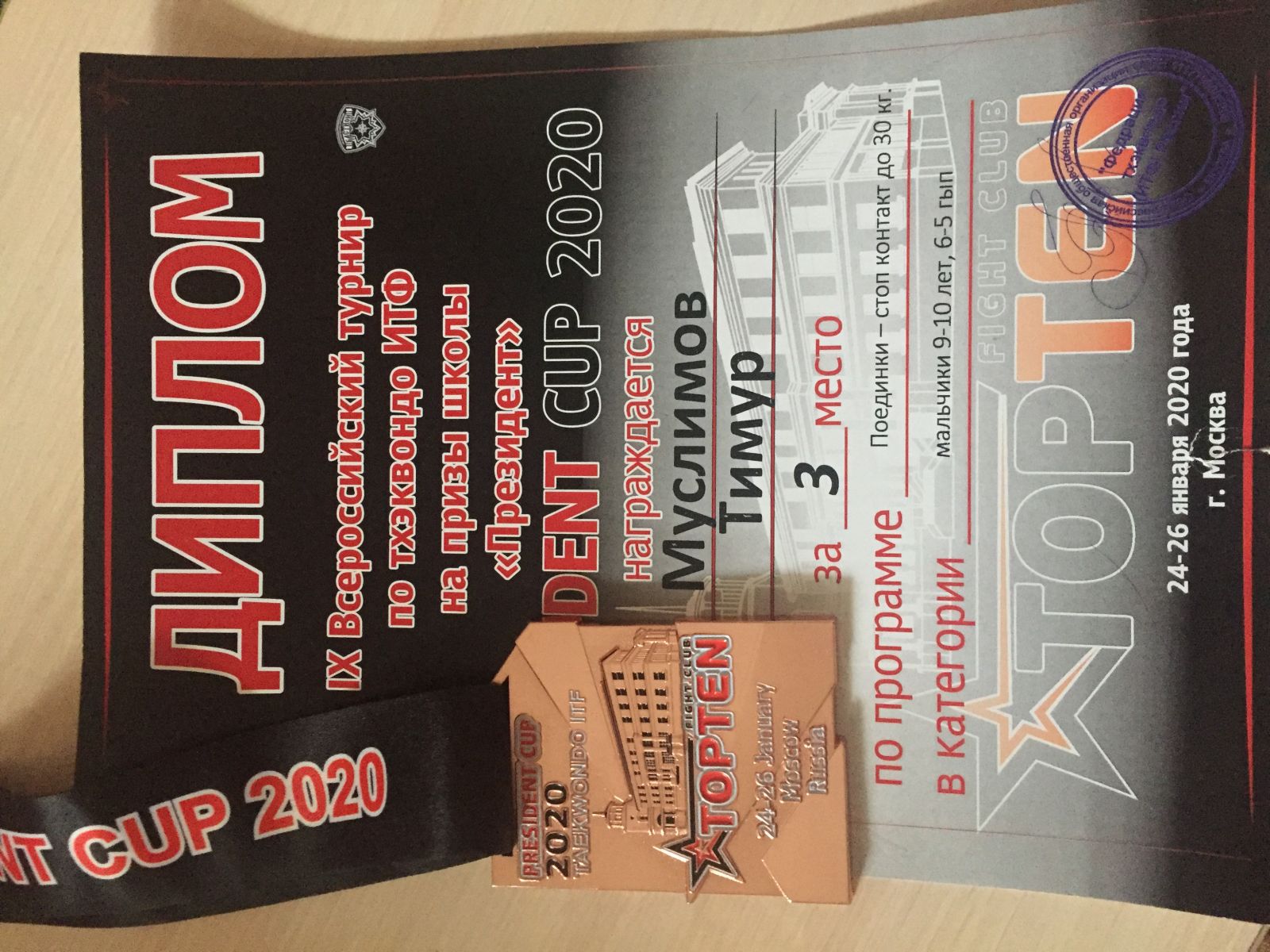 Ученик 4 класса нашей гимназии Муслимов Тимур 24-26 января 2020 года принял участие во Всероссийском турнире по тхэквондо «President Cup 2020», который проходил в городе Москва и занял III место.