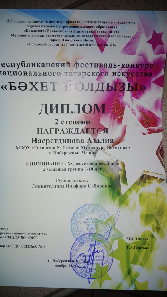 29 нчы ноябрь көнне шәһәр балалар иҗат йортында “Татар кызы – 2019” бәйгесенең финал ярышы булып үтте. Бәйгедә 10 финалист арасыннан 2 нче гимназиянең 3сыйныф укучысы Ишалина Әдилә җиңеп чыкты. Җиңү кемгә генә җиңел бирелә инде ул? Күпсанлы репетицияләр, сыйныф җитәкчесе Хәмидуллина Дания Миннәхмәт кызының күп көч куюы, әнисе белән апасы Айсылуның үгет - нәсихәтләре аңа алдынгы урынны яуларга ярдәм итте. Саф татар телендә матур, аһәңле итеп сөйли алуы, җырга – моңга сәләте тамашачыны таң калдырды. Гимназиянең горурлыгы булган Гатина Лилия Вафир кызы җитәкләгән бию коллективы композициясе Әдиләнең чыгышына ямь өстенә ямь өстәде.