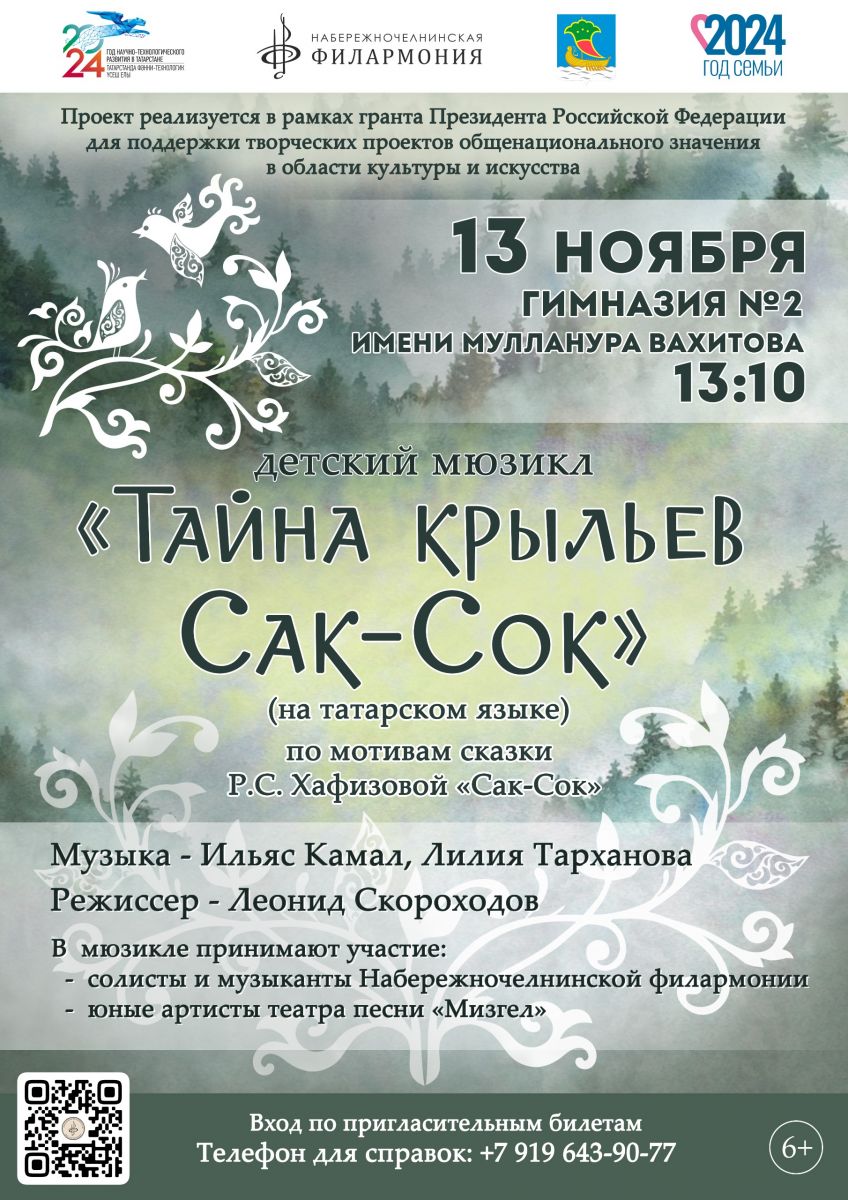 Чаллы филармониясе һәм “Мизгел” театр студиясе яшь артистлары катнашында С. Хафизованың "Сак-Сок канатларының сере" балалар мюзиклын гимназия укучылары яратып карадылар. Мюзикл мәдәният һәм сәнгать өлкәсендә милли эчтәлектәге иҗади проектларны тормышка ашыру өчен каралган Россия Президенты гранты ярдәме белән оештырылган. Бу мюзикл — балаларның иҗади сәләтләрен үстерү белән бергә милли татар традицияләрен саклауга юнәлтелгән проект. «Мюзиклның нигезенә «Сак-Сок» бәете салынган, ләкин ул тәрбияви аспектны яхшылык җиңүе белән тәмамлана торган өметле йомгак белән алыштырган, гаиләдәге иминлекнең һәркемгә тигез бүленеп бирелгәнлеген ассызыклый торган итеп үзгәртелгән. Моннан тыш та мюзикл эчтәлегендә әдәби ачышлар күп яшеренгән, барысын да ачып салсаң, карауның тәме бетәр дип,бар нечкәлекләргә тукталмыйбыз. Мюзиклның режиссеры – Леонид Скороходов - гаҗәеп матур сәхнә әсәре тудырган. Текст, куелыш, сюжет, киемнәр – барысы да энәсеннән җебенә кадәр уйланган, яшь тамашачы зәвыгына туры килерлек итеп сайланган. Композиторлар Ильяс Камалов һәм Лилия Тарханова язган көй милли калоритларга бай, матур яңгырашлы. Мюзикл Бронислав Семичов җитәкчелегендәге халык уен кораллары оркестры башкаруында яңгыраган музыка астында бара. Филармония артистлары Нурислам Яхин, Рэм Кәримов, Гөлназ Каюмова, Миләүшә Фазылҗанова башкарган җыр партияләре тамашачыны хис-кичереш дулкынында йөздерә, вакыйганың чынбарлыгына ышандыра. Әлеге остазлар янында ”Мизгел” театр студиясендә тәрбияләнүче яшь артистлар Илназ Кадыров, Әмирхан Йосыпов, Артур Тукранов сәхнәдә үзләрен иркен тоталар, рольләрен искиткеч оста башкаралар. Яр Чаллы филармония директоры Нәфисә Әхмәтшина җитәкләгән иҗади коллективка, 4 санлы музыка мәктәбенең өстәмә белем бирү педагогы Раилә Тулуповага үсеп килүче буында милли зәвык тәрбияләү өчен куйган тырышлыклары өчен рәхмәт белдерәбез. Әлеге проект бик күп иҗади шәхесләрнең хыял-теләкләрен тормышка ашырып, татар милли сәнгатен заманча пропогандалауга юл ача. Сак-Сок канатларының сере менә шунда! (Энҗе Нурисламова, тәрбия эшләре буенча директор урынбасары).