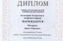 Поздравляем призера республиканского этапа олимпиады школьников по истории Татарстана - ученика 9 класса МАТОРКИНА ЭРНЕСТА! Объявляется благодарность учителю истории КАЮМОВУ РИНАТУ ГАПРТРАХМАНОВИЧУ за подготовку учащегося к олимпиаде.
