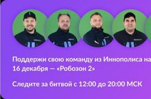 16 декабря 2023 г. в г. Москве пройдет полуфинал и финал Чемпионата по робототехнике с участием 16 команд из России, Турции, Индии и Китая. Зрителей ждет два шоу (с 11:00 до 20:00 по московскому времени), а также познавательная программа. В полуфинале и финале также примет участие команда из г. Иннополиса «Робозон 2». Ссылка на ссылка на сообщество: https://vk.com/robozon_2. Ссылка на прямую трансляцию Чемпионата в сети «Интернет» https://vk.com/video-219465931_456239497