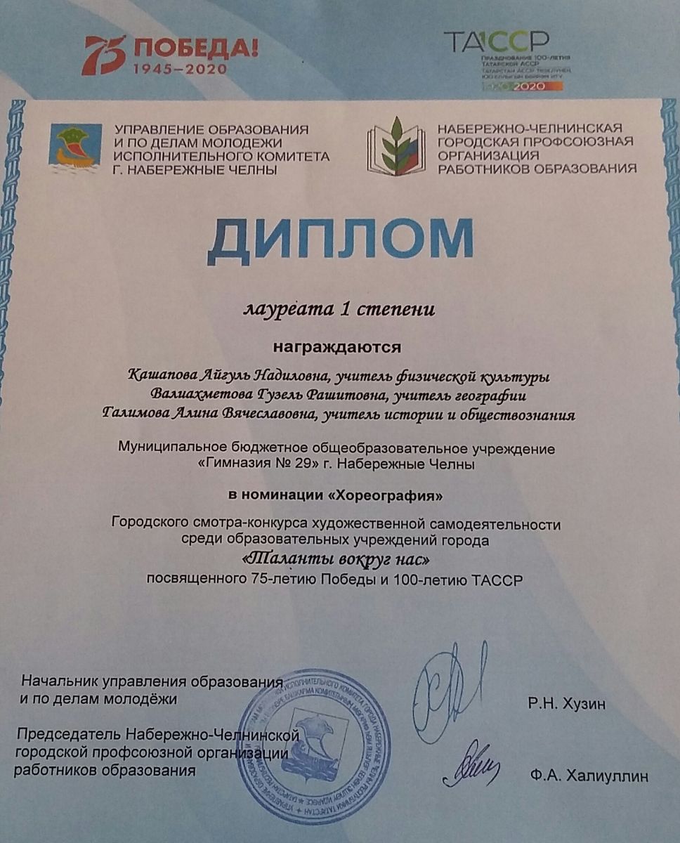 Этот год не исключение. В городском-смотре конкурсе художественной самодеятельности среди образовательных учреждений города «Таланты вокруг нас» в номинации «Хореография» были награждены дипломом лауреата 1 степени.