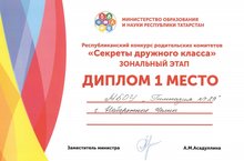 11.01.19 в ГДТДиМ прошел зональный этап республиканского конкурса родительских комитетов «Секреты дружного класса». Родительский комитет 5а класса занял достойное 1 место и будет участвовать на заключительном этапе, который состоится1 февраля в городе Нижнекамске. Желаем успехов!!!