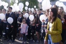 Гимназисты приняли участие в акции "Белые журавли". Сотни белых шаров с журавлями поднялись в небо в память о погибших героях в Великой Отечественной войне.