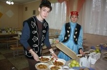 Ребята облачились в национальные костюмы и украсили столовую в народном стиле. Вместо привычной столовой ученики гимназии № 57 на время оказались в настоящей татарской избушке: здесь играет татарская музыка, на стол накрывают девочки в национальных костюмах.