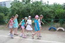После тихого часа в лагере «Байконур» наступает час активных игр и спорта. Всегда есть желающие покататься на роликовых коньках по дорожке школьного стадиона.