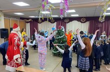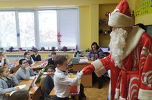 С новогодними поздравлениями команда Деда Мороза и Снегурочки из гимназии отправилась к своим давним друзьям – учащимся СКОШ № 75. Ребята поводили весёлые хороводы вокруг новогодней ёлки и получили из рук Деда Мороза сладкие подарки , купленные на вырученные деньги от благотворительной ярмарки. Спасибо всем учащимся и их родителям за подаренный детям ПРАЗДНИК!!!