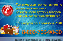 «Внимание! В преддверии начала нового учебного года Н.Челнинский территориальный отдел управления Роспотребнадзора по Республике Татарстан в период с 15 августа по 1 сентября 2018 г. организует работу «горячей линии» по вопросам качества и безопасности детских товаров, школьных принадлежностей.