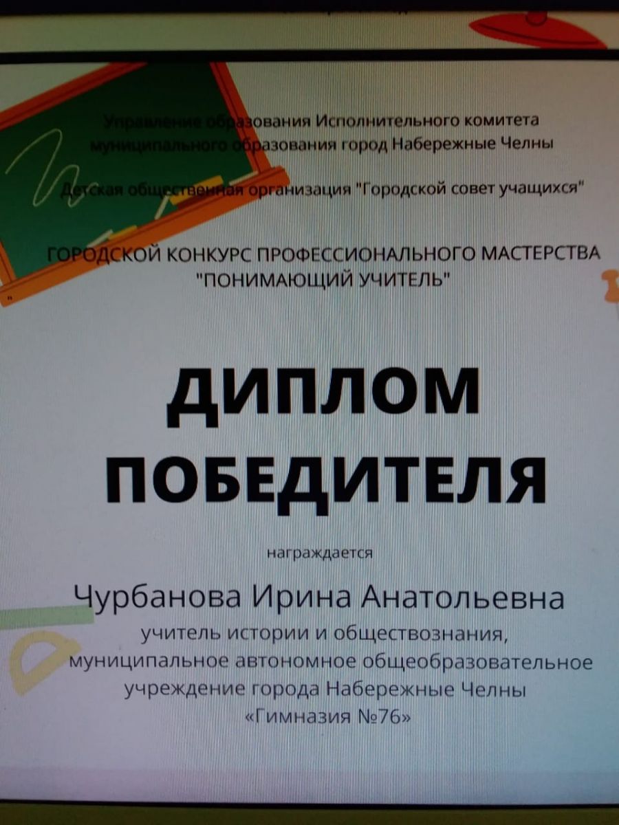 Поздравляем учителя истории и обществознания Чурбанову Ирину Анатольевну с победой в городском конкурсе профессионального мастерства"Понимающий учитель"