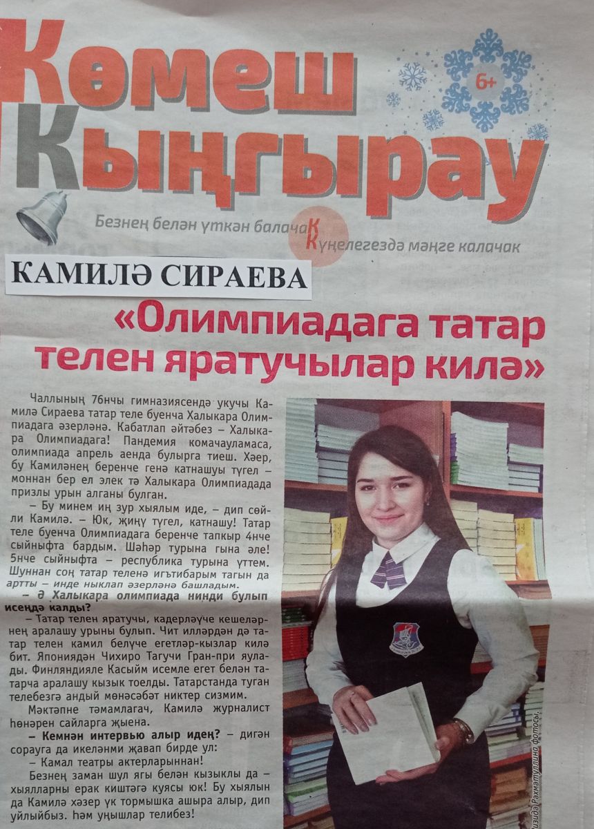 В газете "Серебряный колокольчик" опубликовано интервью Сираевой Камиллы, 10Б класс. Она является многократным призером заключительного этапа Республиканской олимпиады по татарскому языку и Международной олимпиады по татарскому языку. Камилла стала участвоать в олимпиадах в четвертом классе и регулярно демонстрировала высокие результаты в изучении татарского языка. Все годы подготовка к лингвистическим соревнованиям проходила под руководством учителя родного языка Гайсиной Рамзии Рашидовны.