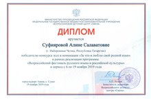 Суфиярова Алина, 6а класс, стала победителем всероссийского конкурса эссе "За что я люблю свой родной язык" в рамках реализации программы "Всероссийский фестиваль русского языка и российской культуры". Алина стала участницей профильной смены по русскому языку и художественному слову во всероссийском детском центре "Смена" г.Анапа.
