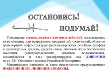 Остановись! Подумай! Совершение взрыва, поджога или иных действий, направленных на разрушение или повреждение предприятий, сооружений, объектов транспортной инфраструктуры (железнодорожных релейных шкафов) и транспортных средств, средств связи, объектов жизнеобеспечения населения (электроподстанций, объектов водоснабжения, газоснабжения и т.п.) квалифицируется как ДИВЕРСИЯ по ст. 281 Уголовного кодекса Российской Федерации. Максимальное наказание за такое преступление предусматривает ПОЖИЗНЕННОЕ ЛИШЕНИЕ СВОБОДЫ.