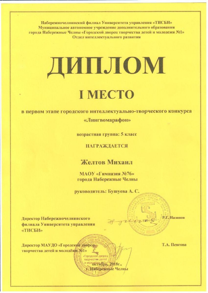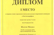 Поздравляем ученика 5а класса Желтова Михаила (учитель: Бушуева А.С.) с победой в городском интеллектуально-творческом конкурсе по английскому языку «Лингвомарафон». Желаем дальнейших успехов в изучении английского языка!Диплом