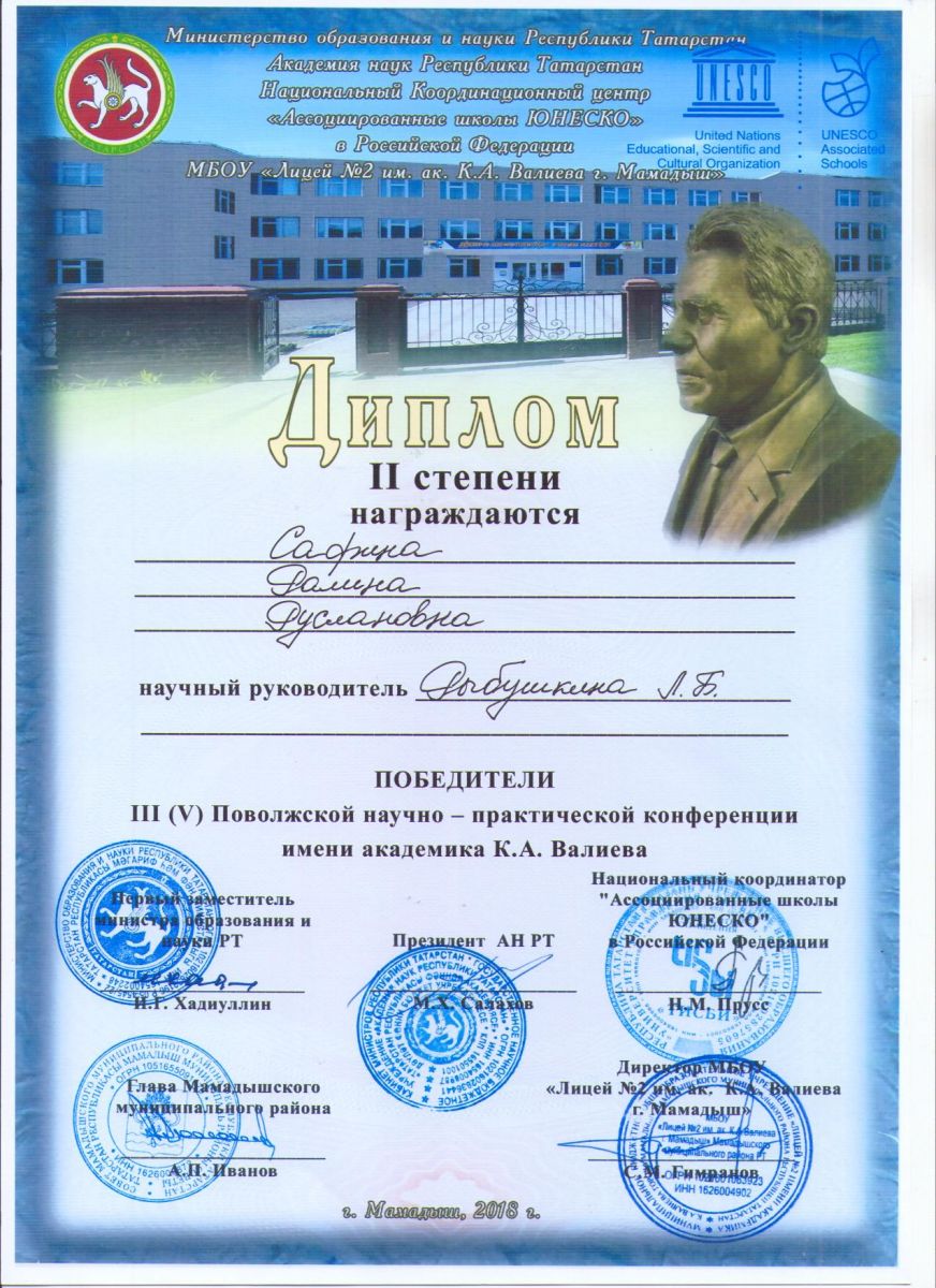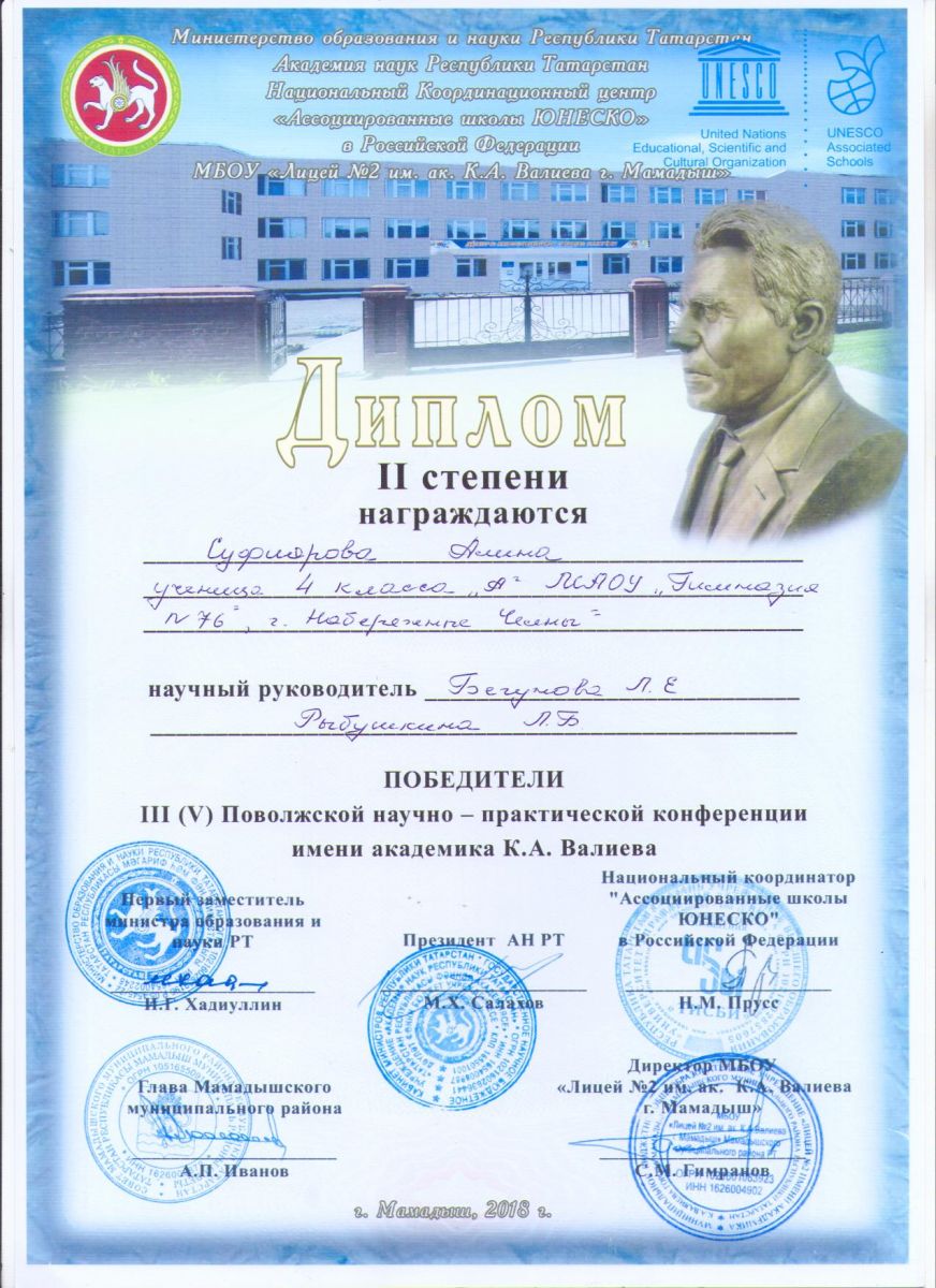 16 февраля 18 учащихся гимназии из 1-4 классов приняли участие в Межрегиональной конференции имени академика Валеева в городе Мамадыш. Первоклассники впервые участвовали в научной конференции такого высокого уровня. Гимназисты достойно представили свои исследовательские работы и были награждены грамотами и призами. Организаторы конференции отметили высокое качество проведенных исследований.