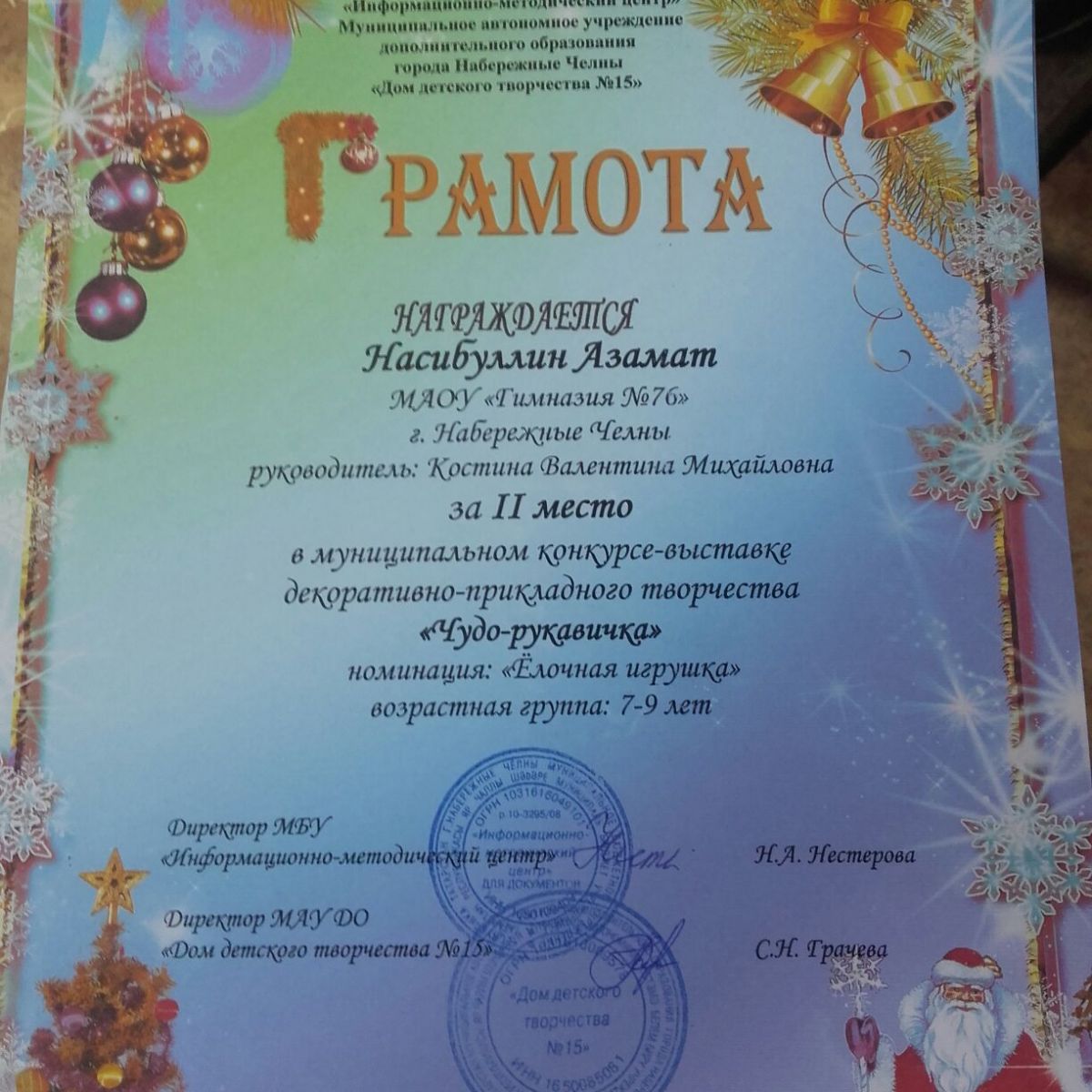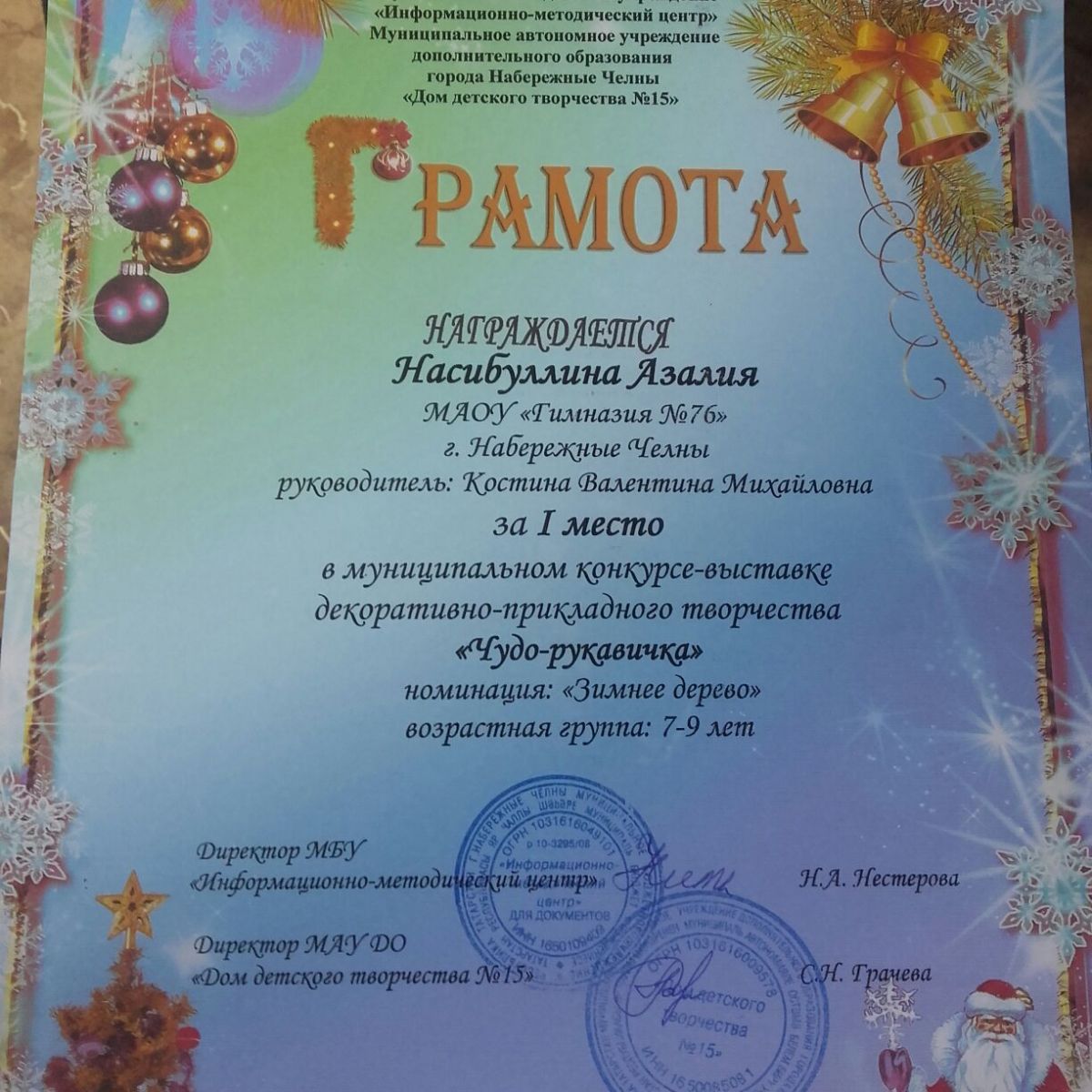 19 января ,в ДТД 15состоялось торжественное награждение участников муниципального конкурса декоративно-прикладного творчества- "Чудо-рукавичка".Работы наших маленьких творцов удостоились высоких наград.Победителем в номинации "Зимнее дерево" стала ученица 1Б класса-Насибуллина Азалия.Насибуллин Азамат,1Б класс занял 2место в номинации"Елочная игрушка",учитель Костина В.М.Пожелаем ребятам дальнейших творческих успехов!