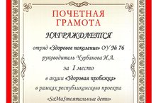 В рамках республиканского проекта "SaMoSтоятельные дети" учащиеся 8в класса, под руководством Чурбановой И.Н., стали победителями в акции "Здоровая пробежка". Участники отряда "Здорове поколение" организовали массовую пробежку с целью популяризации здорового образа жизни. Ребята регулярно становятся победителями в проекте "SaMoSтоятельные дети"