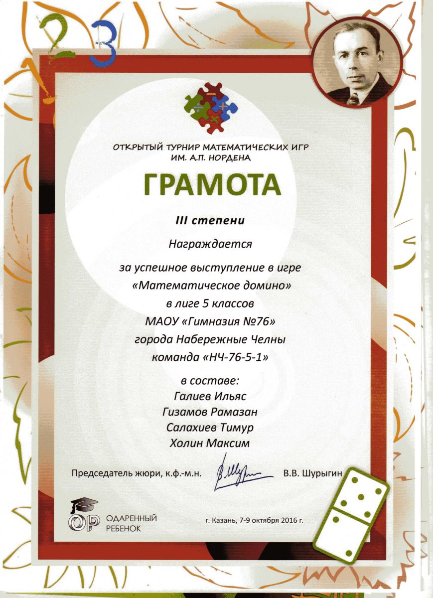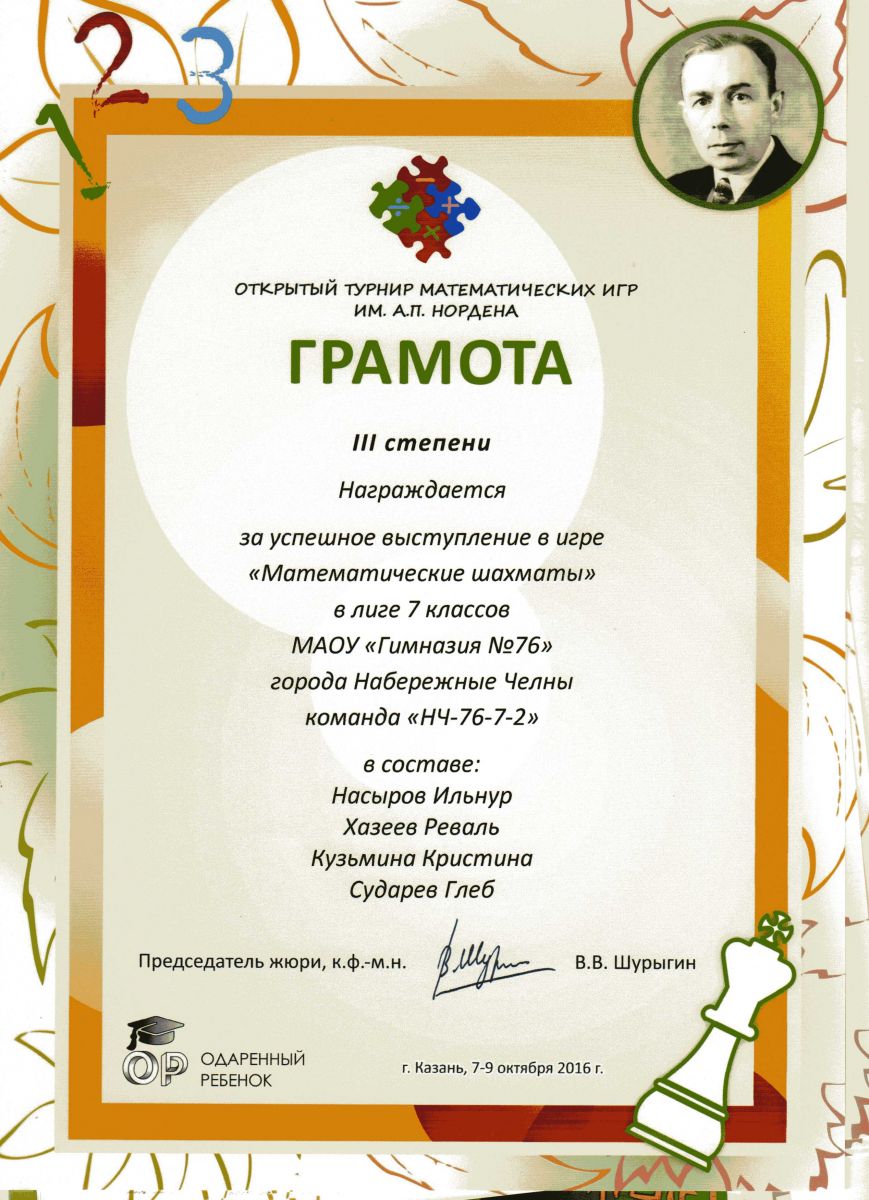 Грамота 3 степени 7 класс "Математический лабиринт"