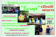 Традиционная XVI смена Лингвистического лагеря "Еurope" на базе отдыха "Росинка" состоится с 22 по 30 августа. Приглашаем всех тех, кто не любит скучать, кто готов променять увлекательный телевизионный фильм на захватывающее исторческое приключение, кто любит управлять, кто умеет или хочет научиться работать в команде.