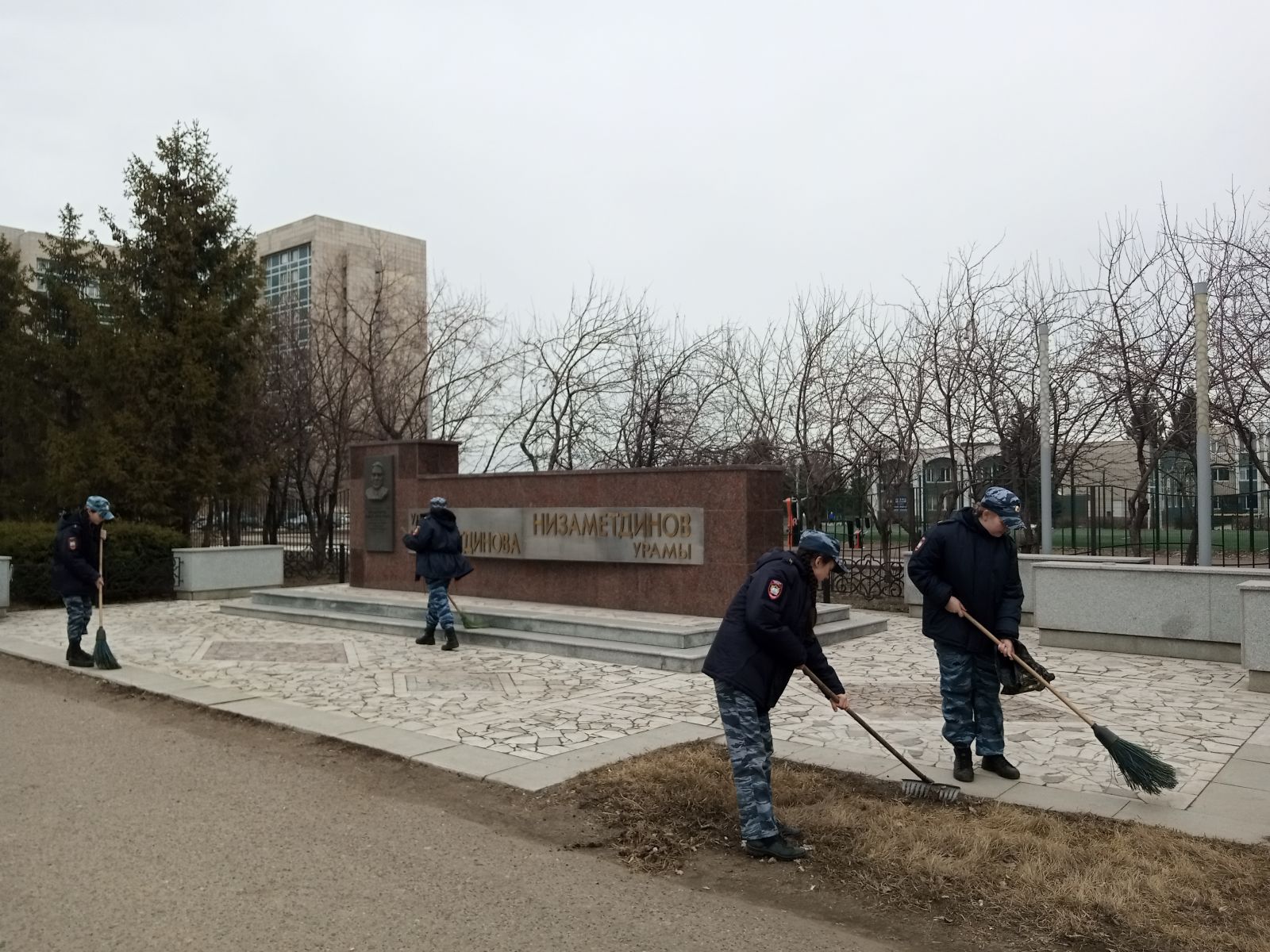 Представители Волонтерского отряда "Добрые сердца" и "Тимуровского отряда" вышли с трудовым десантом к памятнику Низаметдинову.