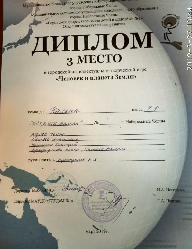 На базе МАУДО г. Наб. Челны «Городской дворец творчества детей и молодежи №1» было проведено интеллектуально-творческая игра «Человек и планета Земля». Команда учащихся 7-8 классов нашей школы заняли в ней 3 место. Руководитель: Мухотдинов Э.Я.