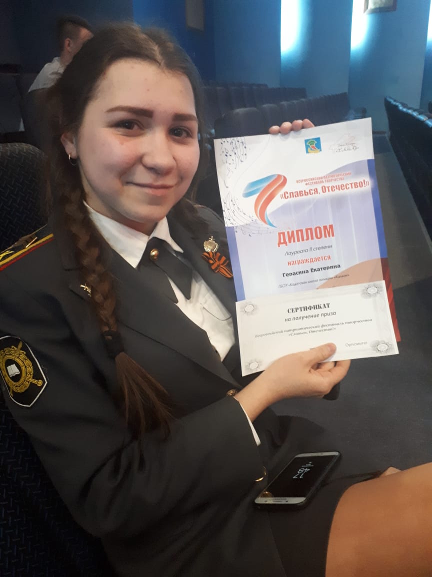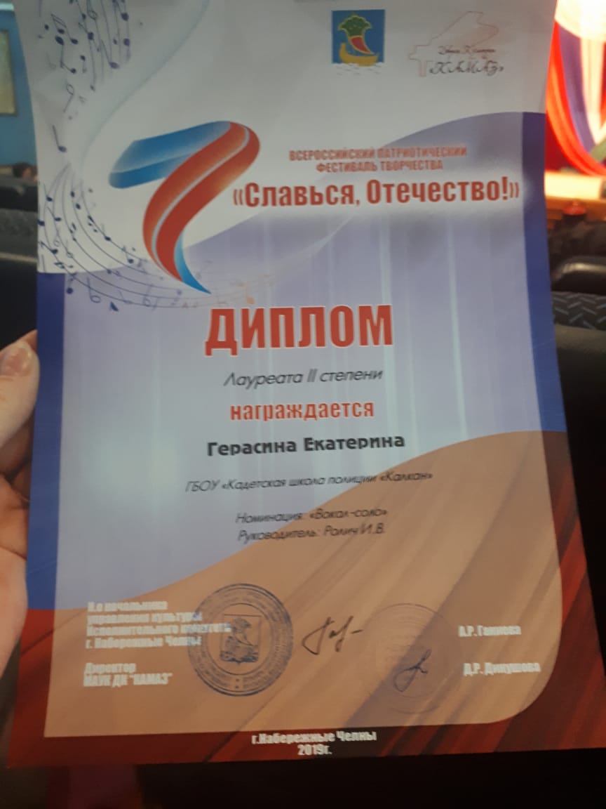 Сегодня в Набережных Челнах состоялся Всероссийский фестиваль творчества «Славься, Отечество!». Организатором фестиваля является «ДК КАМАЗ» при поддержке управления культуры Исполнительного комитета города. Наша воспитанница - кадет 3.1 группы Герасина Екатерина выступила в этом фестивале и в номинации «Вокал-соло» была награждена дипломом лауреата II степени. Руководитель: Ролич Ирина Васильевна.