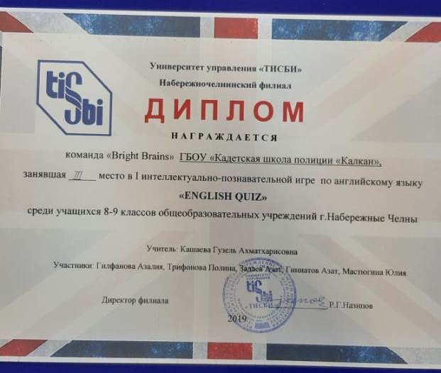 8 февраля 2019 года наши воспитанники приняли участие в 1-ой интеллектуально-познавательной игре по английскому языку «ENGLISH QUIZ» на базе ТИСБИ. Команда «Bright Brains» под руководством Кашаевой Г.А. заняла почетное III место. Молодцы!