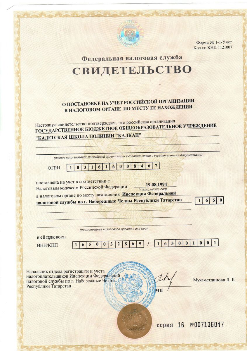 Свидетельство о постановке на учет в налоговый орган