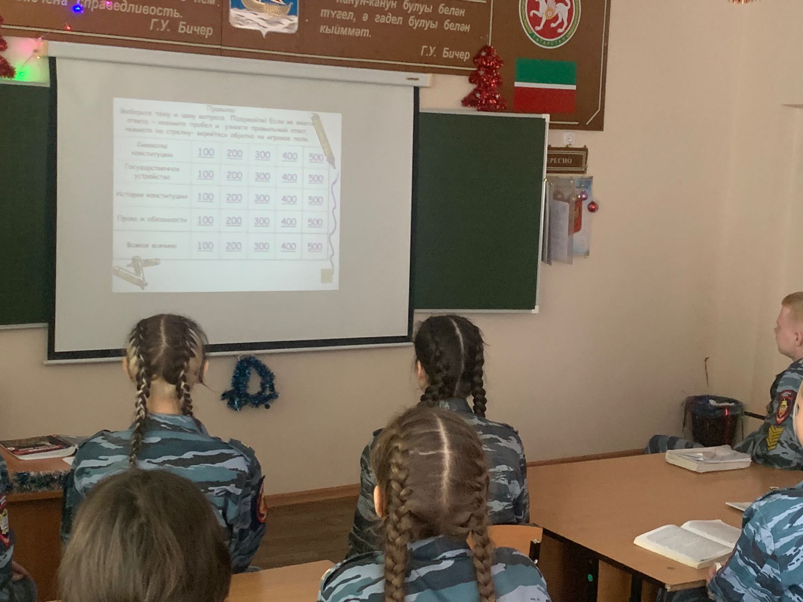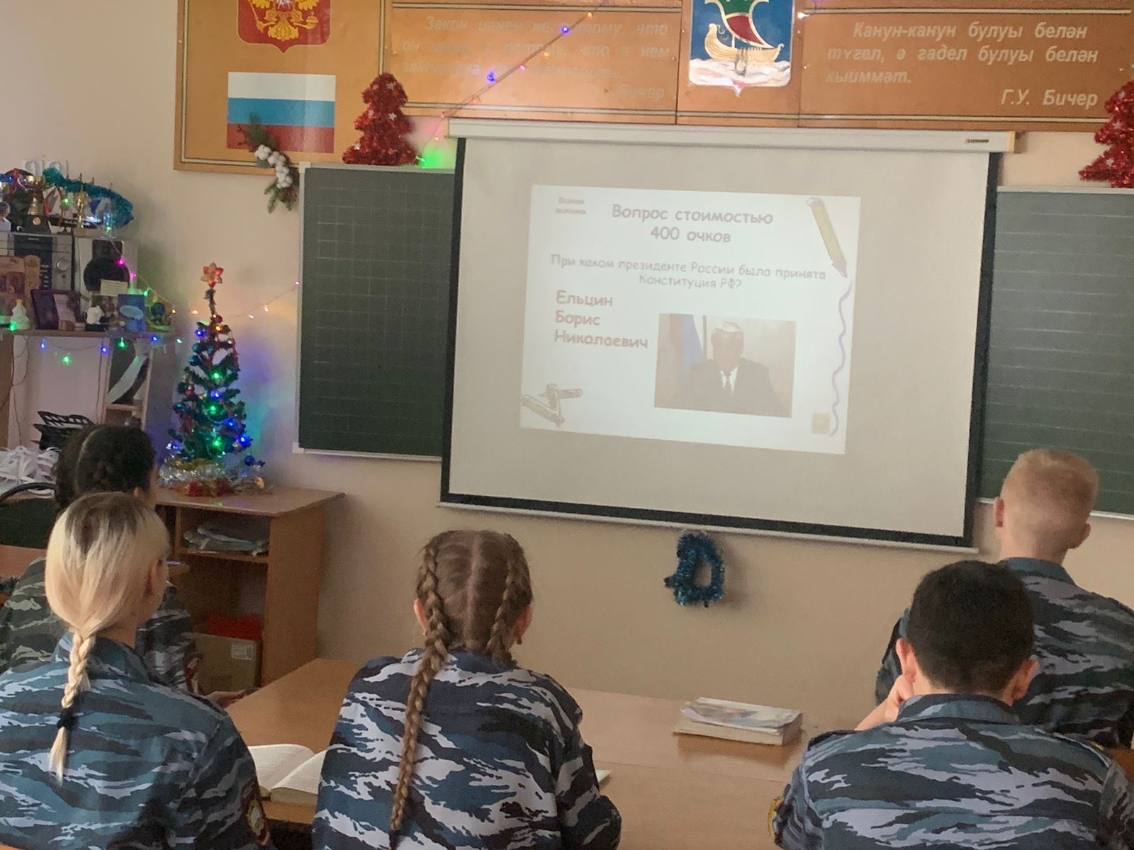 Опубликовано: 12.12.2023Сегодня кадеты 10-ых, 11 - ых классов принли участие в нтеллектуальной игре "Что мы знаем о конституции"